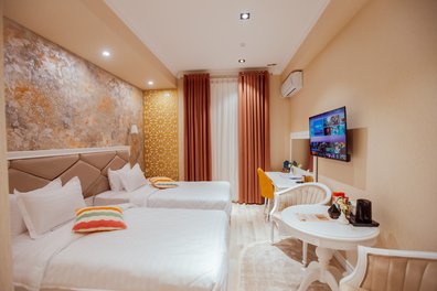 Султан Мухаммад Хорезмшах -- люкс с хорезмским калоритом! Посвященный ему номер с площадью _ квадратных метра перенесет вас в покои правителя Хорезма в 1200-1220 годах. Удобства в номере гарантированно создадут ваш заслуженный лучший отдых!